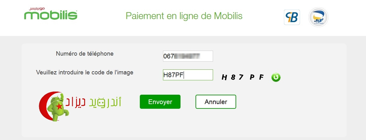 في الخطوة الأولى من العملية تحتاج إلى الولوج إلى الموقع الموالي، ثم كتابة رقم الهاتف الذي تريد شحنه و أدخل الكود الموضح في الصورة و إضغط على Envoyer