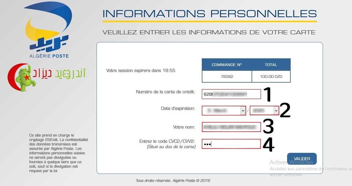 بعد ذلك ستنتقل إلى أرضية الدفع الإلكترونية، و خلال هذه المرحلة الثالثة ستحتاج إلى إدخال معلومات بطاقتك الذهبية كالتالي: