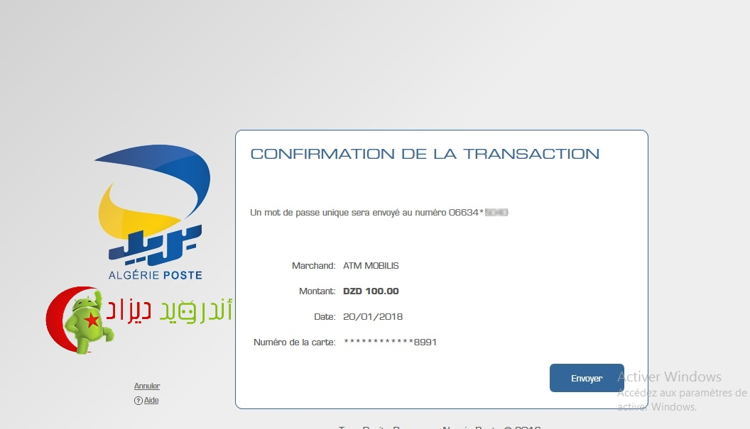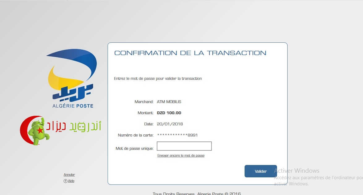 بعد الموافقة سيتم إرسال رمز التحقق إلى الشريحة الأولى التي سجلت بها البطاقة كما أشرنا إليه، أدخله في خانة Mot de passe unique و وافق على المواصلة.