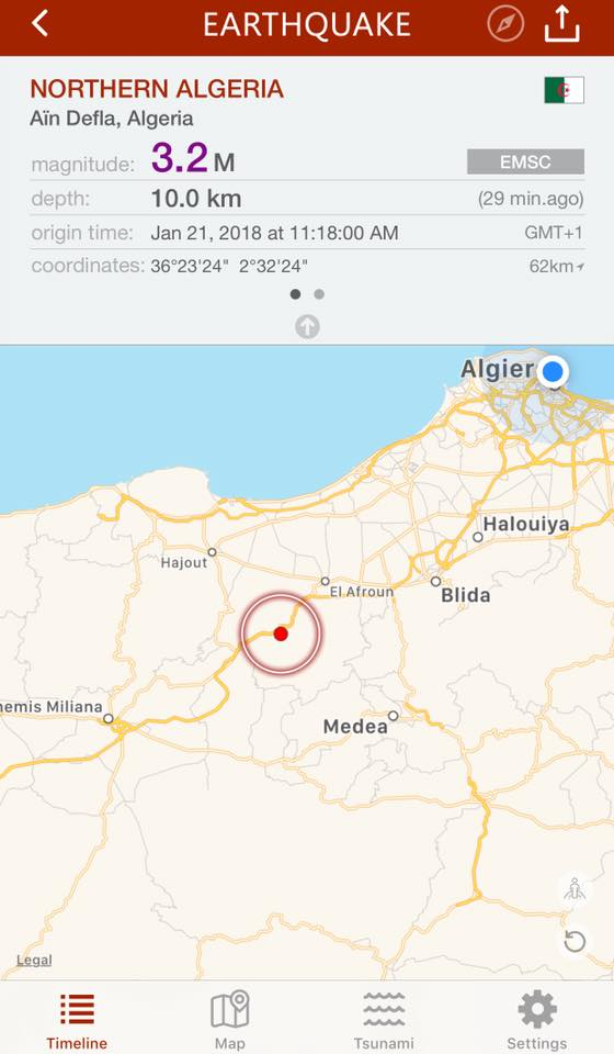 هزة ارضية بقوة 3.2 على سلم رختر احس بها سكان البليدة المدية و عين الدفلى و بعض الولايات المجاورة
